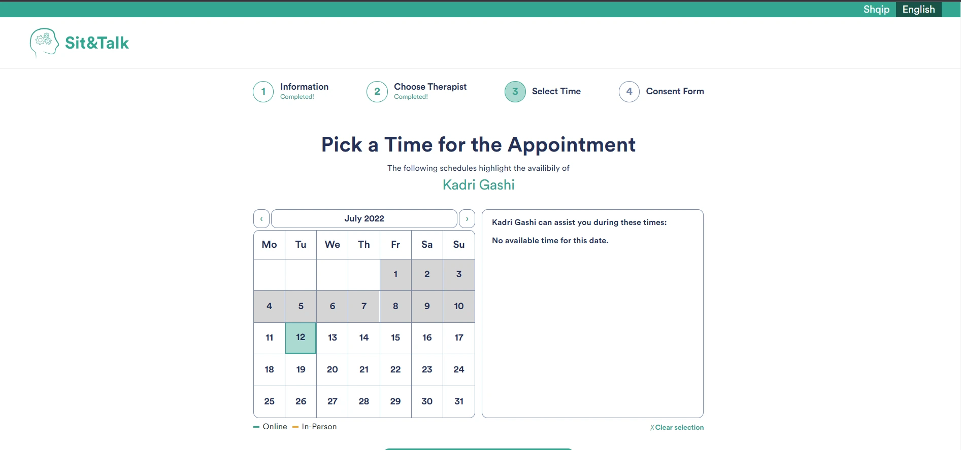 While in the dashboard as a client, you have the option to book a therapist of your choice to have a session.